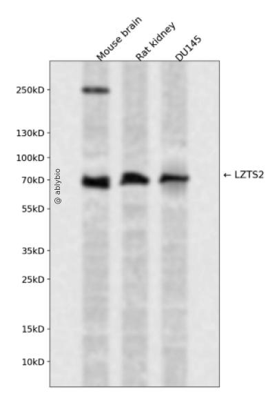 Western blot analysis of LZTS2 expressed in Mouse brain,Rat kidney,DU145 using LZTS2 Rabbit pAb at 1:1000. Secondary antibody: HRP Goat Anti-Rabbit IgG (H+L) at 1:5000. Lysates/proteins: 30ug per lane. Blocking buffer: 5% non-fat dry milk in TBST. Detection: ECL Enhanced Kit. Exposure time: 120s.
