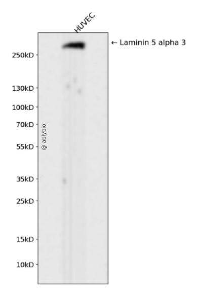 Western blot analysis of Laminin 5 alpha 3 expressed in HUVEC using Laminin 5 alpha 3 Rabbit mAb at 1:1000. Secondary antibody: HRP Goat Anti-Rabbit IgG (H+L) at 1:5000. Lysates/proteins: 30ug per lane. Blocking buffer: 5% non-fat dry milk in TBST. Detection: ECL Enhanced Kit. Exposure time: 120s.
