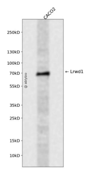Western blot analysis of Lrwd1 expressed in CACO2 using Lrwd1 Rabbit pAb at 1:1000. Secondary antibody: HRP Goat Anti-Rabbit IgG (H+L) at 1:5000. Lysates/proteins: 30ug per lane. Blocking buffer: 5% non-fat dry milk in TBST. Detection: ECL Enhanced Kit. Exposure time: 120s.