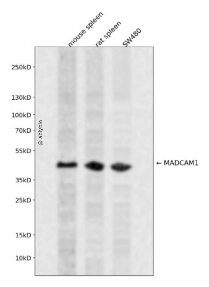 Western blot analysis of MADCAM1 expressed in mouse spleen,rat spleen,SW480 using MADCAM1 Rabbit pAb at 1:1000. Secondary antibody: HRP Goat Anti-Rabbit IgG (H+L) at 1:5000. Lysates/proteins: 30ug per lane. Blocking buffer: 5% non-fat dry milk in TBST. Detection: ECL Enhanced Kit. Exposure time: 120s.