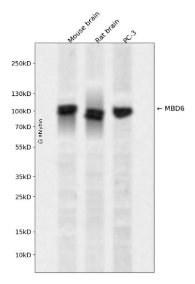 Western blot analysis of MBD6 expressed in Mouse brain,Rat brain,PC-3 using MBD6 Rabbit pAb at 1:1000. Secondary antibody: HRP Goat Anti-Rabbit IgG (H+L) at 1:5000. Lysates/proteins: 30ug per lane. Blocking buffer: 5% non-fat dry milk in TBST. Detection: ECL Enhanced Kit. Exposure time: 120s.