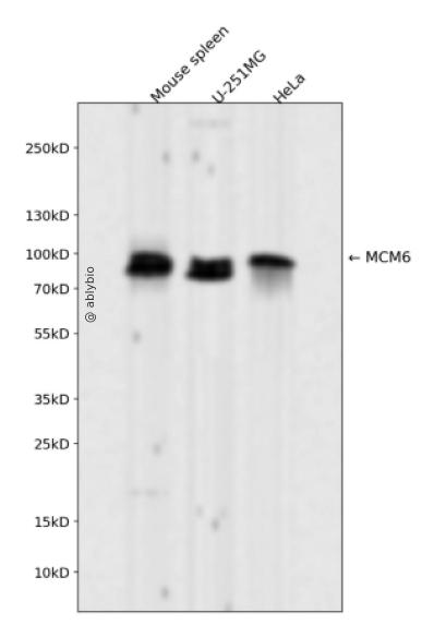Western blot analysis of MCM6 expressed in Mouse spleen,U-251MG,HeLa using MCM6 Rabbit mAb at 1:1000. Secondary antibody: HRP Goat Anti-Rabbit IgG (H+L) at 1:5000. Lysates/proteins: 30ug per lane. Blocking buffer: 5% non-fat dry milk in TBST. Detection: ECL Enhanced Kit. Exposure time: 120s.