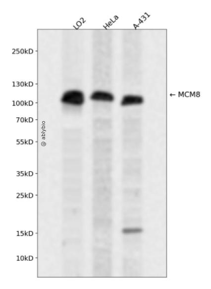 Western blot analysis of MCM8 expressed in LO2,HeLa,A-431 using MCM8 Rabbit pAb at 1:1000. Secondary antibody: HRP Goat Anti-Rabbit IgG (H+L) at 1:5000. Lysates/proteins: 30ug per lane. Blocking buffer: 5% non-fat dry milk in TBST. Detection: ECL Enhanced Kit. Exposure time: 120s.