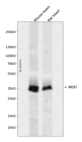 Western blot analysis of MDFI expressed in Mouse heart,Rat heart using MDFI Rabbit pAb at 1:1000. Secondary antibody: HRP Goat Anti-Rabbit IgG (H+L) at 1:5000. Lysates/proteins: 30ug per lane. Blocking buffer: 5% non-fat dry milk in TBST. Detection: ECL Enhanced Kit. Exposure time: 120s.