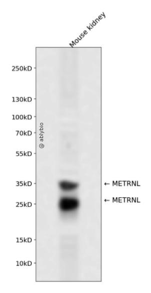 Western blot analysis of METRNL expressed in Mouse kidney using METRNL Rabbit pAb at 1:1000. Secondary antibody: HRP Goat Anti-Rabbit IgG (H+L) at 1:5000. Lysates/proteins: 30ug per lane. Blocking buffer: 5% non-fat dry milk in TBST. Detection: ECL Enhanced Kit. Exposure time: 120s.