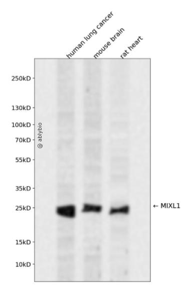 Western blot analysis of MIXL1 expressed in human lung cancer,mouse brain,rat heart using MIXL1 Rabbit pAb at 1:1000. Secondary antibody: HRP Goat Anti-Rabbit IgG (H+L) at 1:5000. Lysates/proteins: 30ug per lane. Blocking buffer: 5% non-fat dry milk in TBST. Detection: ECL Enhanced Kit. Exposure time: 120s.