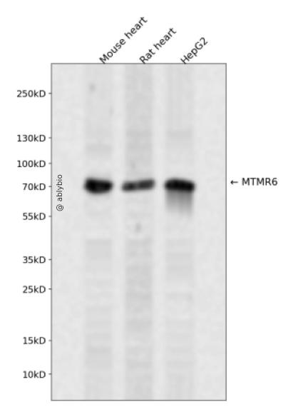 Western blot analysis of MTMR6 expressed in Mouse heart,Rat heart,HepG2 using MTMR6 Rabbit pAb at 1:1000. Secondary antibody: HRP Goat Anti-Rabbit IgG (H+L) at 1:5000. Lysates/proteins: 30ug per lane. Blocking buffer: 5% non-fat dry milk in TBST. Detection: ECL Enhanced Kit. Exposure time: 120s.