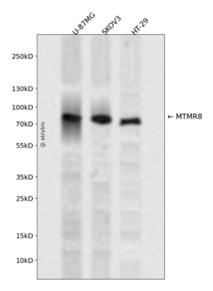 Western blot analysis of MTMR8 expressed in U-87MG,SKOV3,HT-29 using MTMR8 Rabbit pAb at 1:1000. Secondary antibody: HRP Goat Anti-Rabbit IgG (H+L) at 1:5000. Lysates/proteins: 30ug per lane. Blocking buffer: 5% non-fat dry milk in TBST. Detection: ECL Enhanced Kit. Exposure time: 120s.