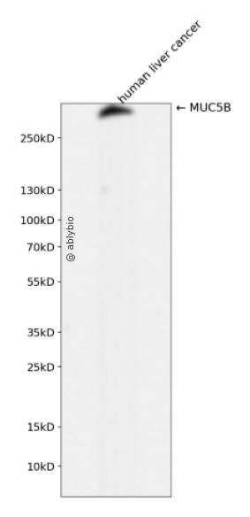 Western blot analysis of MUC5B expressed in human liver cancer using MUC5B at 1:1000. Secondary antibody: HRP Goat Anti-Rabbit IgG (H+L) at 1:5000. Lysates/proteins: 30ug per lane. Blocking buffer: 5% non-fat dry milk in TBST. Detection: ECL Enhanced Kit. Exposure time: 120s.