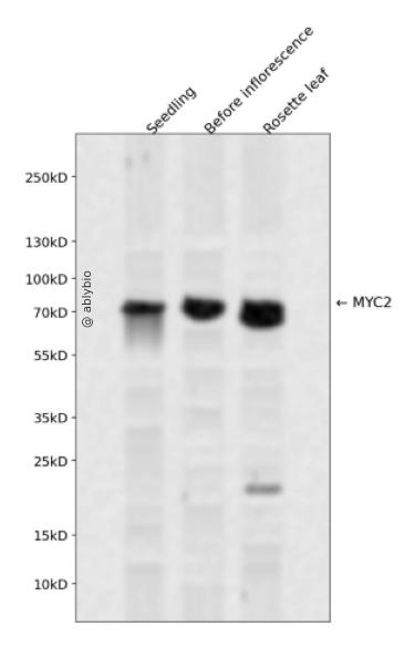 Western blot analysis of MYC2 expressed in Seedling,Before inflorescence,Rosette leaf using MYC2 Rabbit pAb at 1:1000. Secondary antibody: HRP Goat Anti-Rabbit IgG (H+L) at 1:5000. Lysates/proteins: 30ug per lane. Blocking buffer: 5% non-fat dry milk in TBST. Detection: ECL Enhanced Kit. Exposure time: 120s.