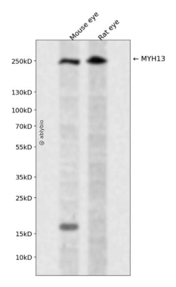 Western blot analysis of MYH13 expressed in Mouse eye,Rat eye using MYH13 Rabbit pAb at 1:1000. Secondary antibody: HRP Goat Anti-Rabbit IgG (H+L) at 1:5000. Lysates/proteins: 30ug per lane. Blocking buffer: 5% non-fat dry milk in TBST. Detection: ECL Enhanced Kit. Exposure time: 120s.