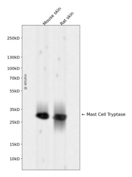 Western blot analysis of Mast Cell Tryptase expressed in Mouse skin,Rat skin using Mast Cell Tryptase Rabbit mAb at 1:1000. Secondary antibody: HRP Goat Anti-Rabbit IgG (H+L) at 1:5000. Lysates/proteins: 30ug per lane. Blocking buffer: 5% non-fat dry milk in TBST. Detection: ECL Enhanced Kit. Exposure time: 120s.