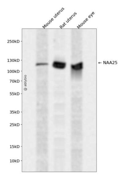 Western blot analysis of NAA25 expressed in Mouse uterus,Rat uterus,Mouse eye using NAA25 Rabbit pAb at 1:1000. Secondary antibody: HRP Goat Anti-Rabbit IgG (H+L) at 1:5000. Lysates/proteins: 30ug per lane. Blocking buffer: 5% non-fat dry milk in TBST. Detection: ECL Enhanced Kit. Exposure time: 120s.