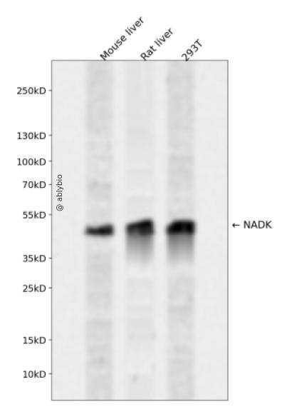 Western blot analysis of NADK expressed in Mouse liver,Rat liver,293T using NADK Rabbit pAb at 1:1000. Secondary antibody: HRP Goat Anti-Rabbit IgG (H+L) at 1:5000. Lysates/proteins: 30ug per lane. Blocking buffer: 5% non-fat dry milk in TBST. Detection: ECL Enhanced Kit. Exposure time: 120s.