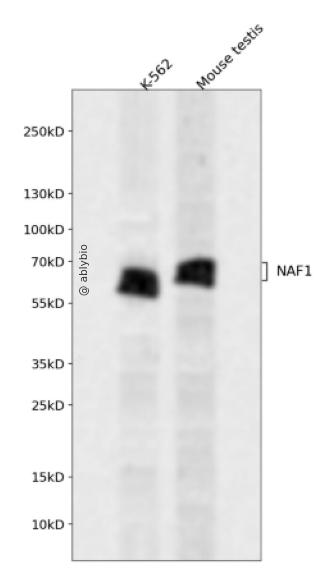 Western blot analysis of NAF1 expressed in K-562,Mouse testis using NAF1 Rabbit pAb at 1:1000. Secondary antibody: HRP Goat Anti-Rabbit IgG (H+L) at 1:5000. Lysates/proteins: 30ug per lane. Blocking buffer: 5% non-fat dry milk in TBST. Detection: ECL Enhanced Kit. Exposure time: 120s.