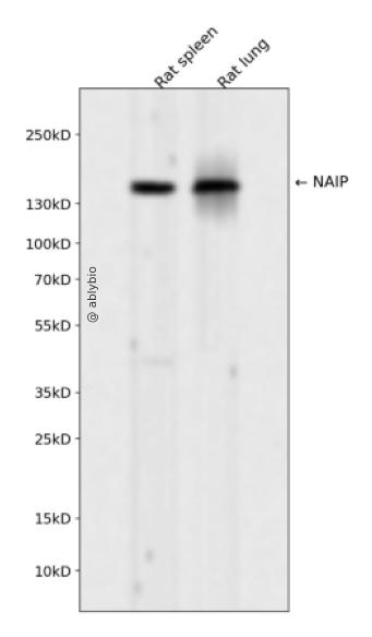 Western blot analysis of NAIP expressed in Rat spleen,Rat lung using NAIP Rabbit mAb at 1:1000. Secondary antibody: HRP Goat Anti-Rabbit IgG (H+L) at 1:5000. Lysates/proteins: 30ug per lane. Blocking buffer: 5% non-fat dry milk in TBST. Detection: ECL Enhanced Kit. Exposure time: 120s.