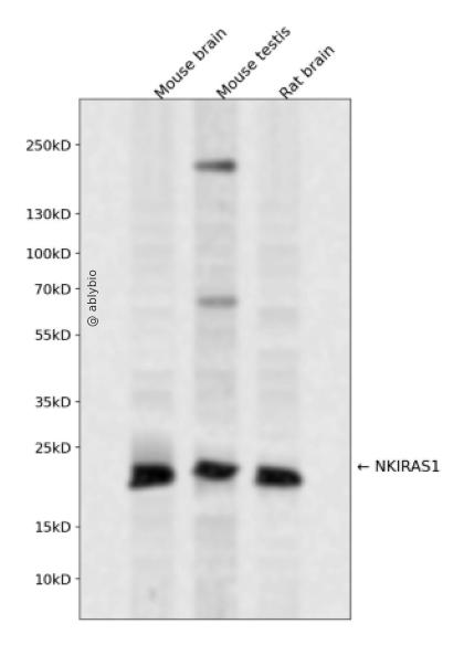 Western blot analysis of NKIRAS1 expressed in Mouse brain,Mouse testis,Rat brain using NKIRAS1 Rabbit pAb at 1:1000. Secondary antibody: HRP Goat Anti-Rabbit IgG (H+L) at 1:5000. Lysates/proteins: 30ug per lane. Blocking buffer: 5% non-fat dry milk in TBST. Detection: ECL Enhanced Kit. Exposure time: 120s.