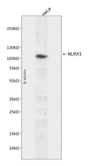 Western blot analysis of NLRX1 expressed in HeLa using NLRX1 Rabbit pAb at 1:1000. Secondary antibody: HRP Goat Anti-Rabbit IgG (H+L) at 1:5000. Lysates/proteins: 30ug per lane. Blocking buffer: 5% non-fat dry milk in TBST. Detection: ECL Enhanced Kit. Exposure time: 120s.