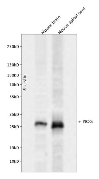Western blot analysis of NOG expressed in Mouse brain,Mouse spinal cord using NOG Rabbit pAb at 1:1000. Secondary antibody: HRP Goat Anti-Rabbit IgG (H+L) at 1:5000. Lysates/proteins: 30ug per lane. Blocking buffer: 5% non-fat dry milk in TBST. Detection: ECL Enhanced Kit. Exposure time: 120s.