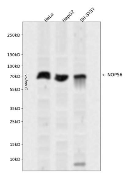 Western blot analysis of NOP56 expressed in HeLa,HepG2,SH-SY5Y using NOP56 Rabbit pAb at 1:1000. Secondary antibody: HRP Goat Anti-Rabbit IgG (H+L) at 1:5000. Lysates/proteins: 30ug per lane. Blocking buffer: 5% non-fat dry milk in TBST. Detection: ECL Enhanced Kit. Exposure time: 120s.
