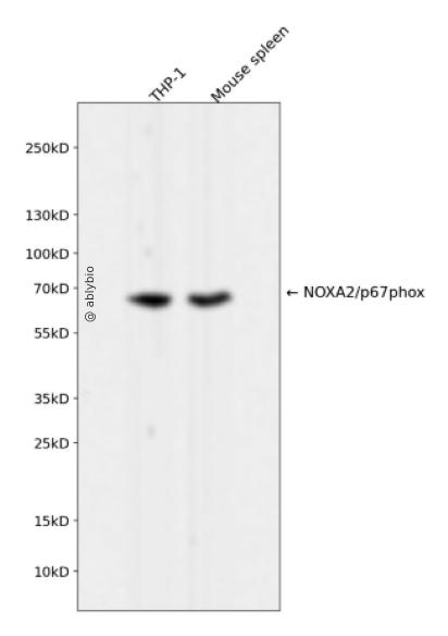 Western blot analysis of NOXA2/p67phox expressed in THP-1,Mouse spleen using NOXA2/p67phox Rabbit mAb at 1:1000. Secondary antibody: HRP Goat Anti-Rabbit IgG (H+L) at 1:5000. Lysates/proteins: 30ug per lane. Blocking buffer: 5% non-fat dry milk in TBST. Detection: ECL Enhanced Kit. Exposure time: 120s.