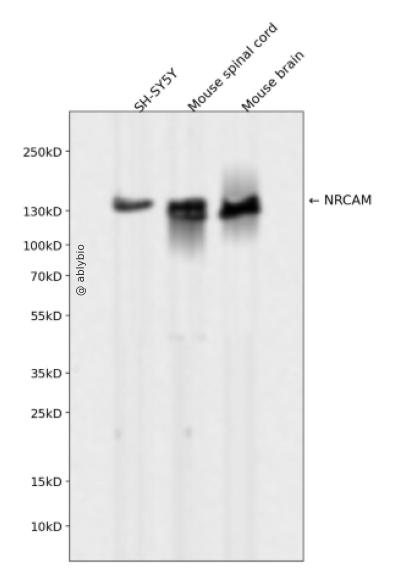 Western blot analysis of NRCAM expressed in SH-SY5Y,Mouse spinal cord,Mouse brain using NRCAM Rabbit mAb at 1:1000. Secondary antibody: HRP Goat Anti-Rabbit IgG (H+L) at 1:5000. Lysates/proteins: 30ug per lane. Blocking buffer: 5% non-fat dry milk in TBST. Detection: ECL Enhanced Kit. Exposure time: 120s.