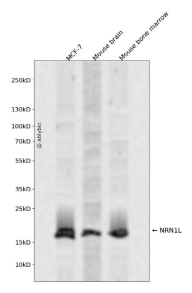 Western blot analysis of NRN1L expressed in MCF-7,Mouse brain,Mouse bone marrow using NRN1L Rabbit pAb at 1:1000. Secondary antibody: HRP Goat Anti-Rabbit IgG (H+L) at 1:5000. Lysates/proteins: 30ug per lane. Blocking buffer: 5% non-fat dry milk in TBST. Detection: ECL Enhanced Kit. Exposure time: 120s.