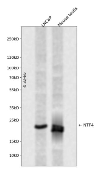Western blot analysis of NTF4 expressed in LNCaP,Mouse testis using NTF4 Rabbit pAb at 1:1000. Secondary antibody: HRP Goat Anti-Rabbit IgG (H+L) at 1:5000. Lysates/proteins: 30ug per lane. Blocking buffer: 5% non-fat dry milk in TBST. Detection: ECL Enhanced Kit. Exposure time: 120s.