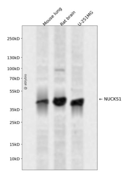 Western blot analysis of NUCKS1 expressed in Mouse lung,Rat brain,U-251MG using NUCKS1 Rabbit pAb at 1:1000. Secondary antibody: HRP Goat Anti-Rabbit IgG (H+L) at 1:5000. Lysates/proteins: 30ug per lane. Blocking buffer: 5% non-fat dry milk in TBST. Detection: ECL Enhanced Kit. Exposure time: 120s.