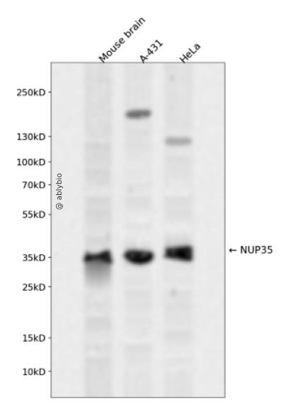 Western blot analysis of NUP35 expressed in Mouse brain,A-431,HeLa using NUP35 Rabbit pAb at 1:1000. Secondary antibody: HRP Goat Anti-Rabbit IgG (H+L) at 1:5000. Lysates/proteins: 30ug per lane. Blocking buffer: 5% non-fat dry milk in TBST. Detection: ECL Enhanced Kit. Exposure time: 120s.