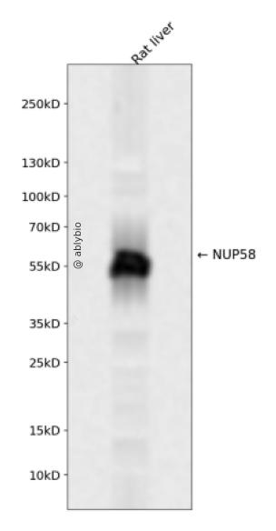 Western blot analysis of NUP58 expressed in Rat liver using NUP58 Rabbit pAb at 1:1000. Secondary antibody: HRP Goat Anti-Rabbit IgG (H+L) at 1:5000. Lysates/proteins: 30ug per lane. Blocking buffer: 5% non-fat dry milk in TBST. Detection: ECL Enhanced Kit. Exposure time: 120s.