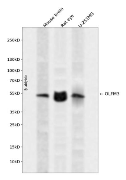Western blot analysis of OLFM3 expressed in Mouse brain,Rat eye,U-251MG using OLFM3 Rabbit pAb at 1:1000. Secondary antibody: HRP Goat Anti-Rabbit IgG (H+L) at 1:5000. Lysates/proteins: 30ug per lane. Blocking buffer: 5% non-fat dry milk in TBST. Detection: ECL Enhanced Kit. Exposure time: 120s.