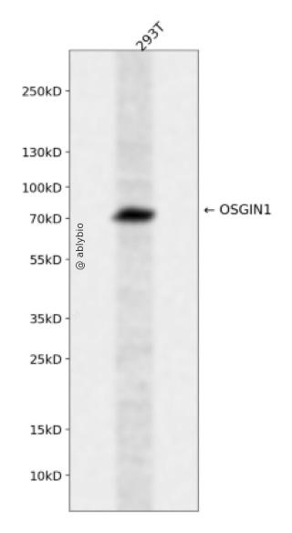 Western blot analysis of OSGIN1 expressed in 293T using OSGIN1 Rabbit pAb at 1:1000. Secondary antibody: HRP Goat Anti-Rabbit IgG (H+L) at 1:5000. Lysates/proteins: 30ug per lane. Blocking buffer: 5% non-fat dry milk in TBST. Detection: ECL Enhanced Kit. Exposure time: 120s.