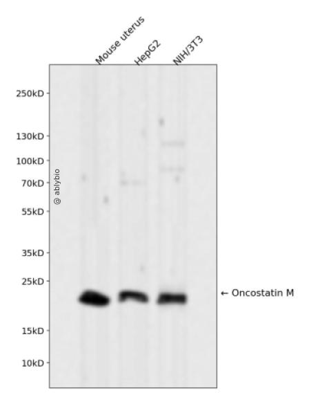 Western blot analysis of Oncostatin M expressed in Mouse uterus,HepG2,NIH/3T3 using Oncostatin M Rabbit mAb at 1:1000. Secondary antibody: HRP Goat Anti-Rabbit IgG (H+L) at 1:5000. Lysates/proteins: 30ug per lane. Blocking buffer: 5% non-fat dry milk in TBST. Detection: ECL Enhanced Kit. Exposure time: 120s.