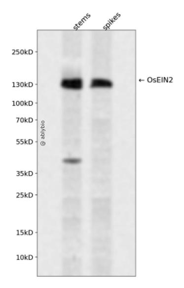 Western blot analysis of OsEIN2 expressed in stems,spikes using OsEIN2 Rabbit pAb at 1:1000. Secondary antibody: HRP Goat Anti-Rabbit IgG (H+L) at 1:5000. Lysates/proteins: 30ug per lane. Blocking buffer: 5% non-fat dry milk in TBST. Detection: ECL Enhanced Kit. Exposure time: 120s.
