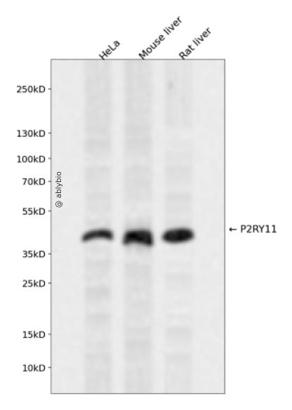 Western blot analysis of P2RY11 expressed in HeLa,Mouse liver,Rat liver using P2RY11 Rabbit pAb at 1:1000. Secondary antibody: HRP Goat Anti-Rabbit IgG (H+L) at 1:5000. Lysates/proteins: 30ug per lane. Blocking buffer: 5% non-fat dry milk in TBST. Detection: ECL Enhanced Kit. Exposure time: 120s.