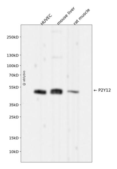 Western blot analysis of P2Y12 expressed in HUVEC,mouse liver,rat muscle using P2Y12 Rabbit mAb at 1:1000. Secondary antibody: HRP Goat Anti-Rabbit IgG (H+L) at 1:5000. Lysates/proteins: 30ug per lane. Blocking buffer: 5% non-fat dry milk in TBST. Detection: ECL Enhanced Kit. Exposure time: 120s.