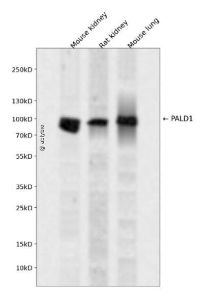 Western blot analysis of PALD1 expressed in Mouse kidney,Rat kidney,Mouse lung using PALD1 Rabbit pAb at 1:1000. Secondary antibody: HRP Goat Anti-Rabbit IgG (H+L) at 1:5000. Lysates/proteins: 30ug per lane. Blocking buffer: 5% non-fat dry milk in TBST. Detection: ECL Enhanced Kit. Exposure time: 120s.