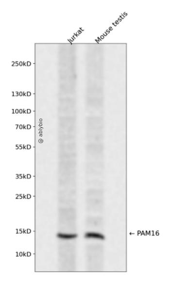 Western blot analysis of PAM16 expressed in Jurkat,Mouse testis using PAM16 Rabbit pAb at 1:1000. Secondary antibody: HRP Goat Anti-Rabbit IgG (H+L) at 1:5000. Lysates/proteins: 30ug per lane. Blocking buffer: 5% non-fat dry milk in TBST. Detection: ECL Enhanced Kit. Exposure time: 120s.