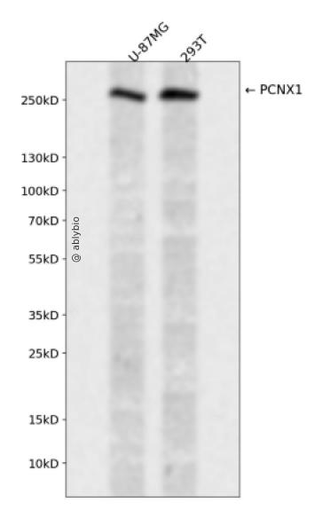 Western blot analysis of PCNX1 expressed in U-87MG,293T using PCNX1 Rabbit pAb at 1:1000. Secondary antibody: HRP Goat Anti-Rabbit IgG (H+L) at 1:5000. Lysates/proteins: 30ug per lane. Blocking buffer: 5% non-fat dry milk in TBST. Detection: ECL Enhanced Kit. Exposure time: 120s.