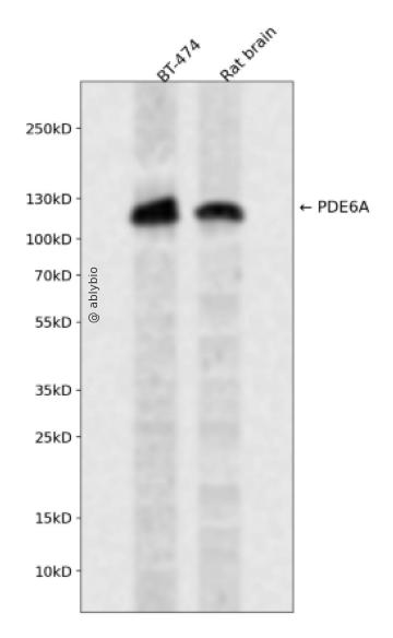 Western blot analysis of PDE6A expressed in BT-474,Rat brain using PDE6A Rabbit pAb at 1:1000. Secondary antibody: HRP Goat Anti-Rabbit IgG (H+L) at 1:5000. Lysates/proteins: 30ug per lane. Blocking buffer: 5% non-fat dry milk in TBST. Detection: ECL Enhanced Kit. Exposure time: 120s.