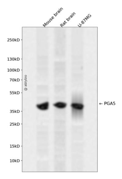 Western blot analysis of PGA5 expressed in Mouse brain,Rat brain,U-87MG using PGA5 Rabbit pAb at 1:1000. Secondary antibody: HRP Goat Anti-Rabbit IgG (H+L) at 1:5000. Lysates/proteins: 30ug per lane. Blocking buffer: 5% non-fat dry milk in TBST. Detection: ECL Enhanced Kit. Exposure time: 120s.