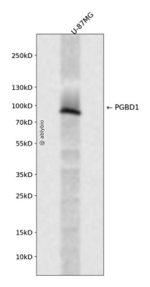 Western blot analysis of PGBD1 expressed in U-87MG using PGBD1 Rabbit pAb at 1:1000. Secondary antibody: HRP Goat Anti-Rabbit IgG (H+L) at 1:5000. Lysates/proteins: 30ug per lane. Blocking buffer: 5% non-fat dry milk in TBST. Detection: ECL Enhanced Kit. Exposure time: 120s.