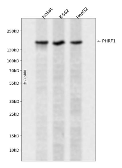 Western blot analysis of PHRF1 expressed in Juakat,K-562,HepG2 using PHRF1 Rabbit pAb at 1:1000. Secondary antibody: HRP Goat Anti-Rabbit IgG (H+L) at 1:5000. Lysates/proteins: 30ug per lane. Blocking buffer: 5% non-fat dry milk in TBST. Detection: ECL Enhanced Kit. Exposure time: 120s.