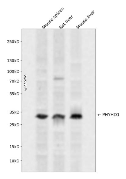 Western blot analysis of PHYHD1 expressed in Mouse spleen,Rat liver,Mouse liver using PHYHD1 Rabbit pAb at 1:1000. Secondary antibody: HRP Goat Anti-Rabbit IgG (H+L) at 1:5000. Lysates/proteins: 30ug per lane. Blocking buffer: 5% non-fat dry milk in TBST. Detection: ECL Enhanced Kit. Exposure time: 120s.