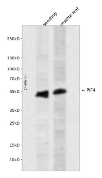 Western blot analysis of PIF4 expressed in seedling,rosette leaf using PIF4 Rabbit pAb at 1:1000. Secondary antibody: HRP Goat Anti-Rabbit IgG (H+L) at 1:5000. Lysates/proteins: 30ug per lane. Blocking buffer: 5% non-fat dry milk in TBST. Detection: ECL Enhanced Kit. Exposure time: 120s.