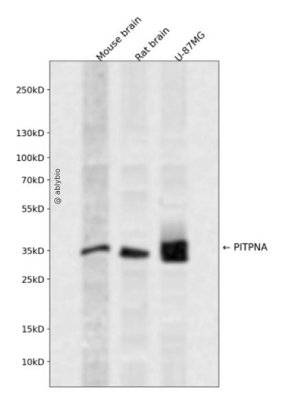 Western blot analysis of PITPNA expressed in Mouse brain,Rat brain,U-87MG using PITPNA Rabbit pAb at 1:1000. Secondary antibody: HRP Goat Anti-Rabbit IgG (H+L) at 1:5000. Lysates/proteins: 30ug per lane. Blocking buffer: 5% non-fat dry milk in TBST. Detection: ECL Enhanced Kit. Exposure time: 120s.