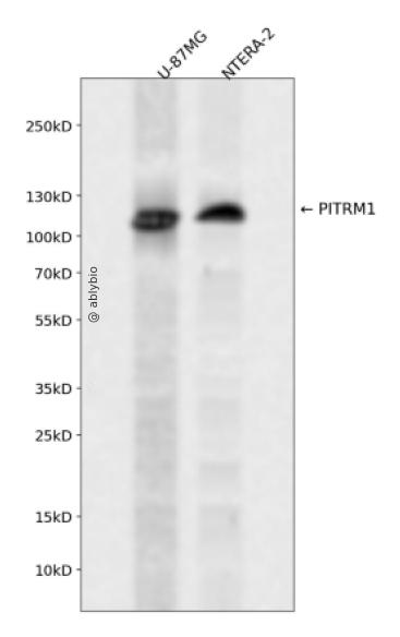 Western blot analysis of PITRM1 expressed in U-87MG,NTERA-2 using PITRM1 Rabbit pAb at 1:1000. Secondary antibody: HRP Goat Anti-Rabbit IgG (H+L) at 1:5000. Lysates/proteins: 30ug per lane. Blocking buffer: 5% non-fat dry milk in TBST. Detection: ECL Enhanced Kit. Exposure time: 120s.