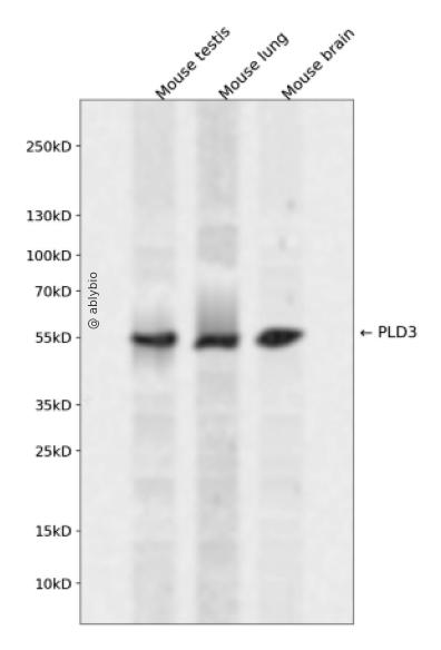 Western blot analysis of PLD3 expressed in Mouse testis,Mouse lung,Mouse brain using PLD3 Rabbit pAb at 1:1000. Secondary antibody: HRP Goat Anti-Rabbit IgG (H+L) at 1:5000. Lysates/proteins: 30ug per lane. Blocking buffer: 5% non-fat dry milk in TBST. Detection: ECL Enhanced Kit. Exposure time: 120s.