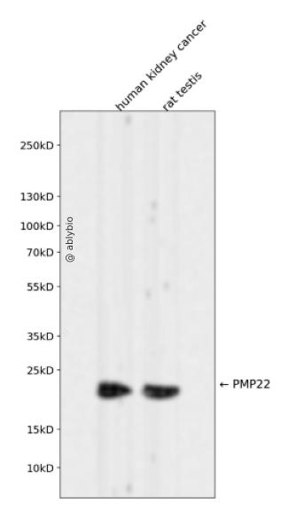 Western blot analysis of PMP22 expressed in human kidney cancer,rat testis using PMP22 Rabbit mAb at 1:1000. Secondary antibody: HRP Goat Anti-Rabbit IgG (H+L) at 1:5000. Lysates/proteins: 30ug per lane. Blocking buffer: 5% non-fat dry milk in TBST. Detection: ECL Enhanced Kit. Exposure time: 120s.
